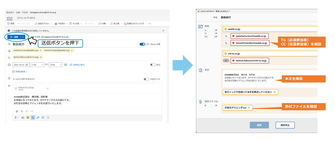 重要なメール送信時は、ポップアップで「宛先」、「本文」、「添付ファイル」を再チェック!