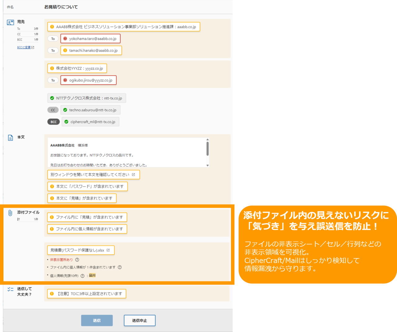CipherCraft/Mail 8では、メール送信時は、ポップアップで非表示領域のあり/なしまで再チェック!