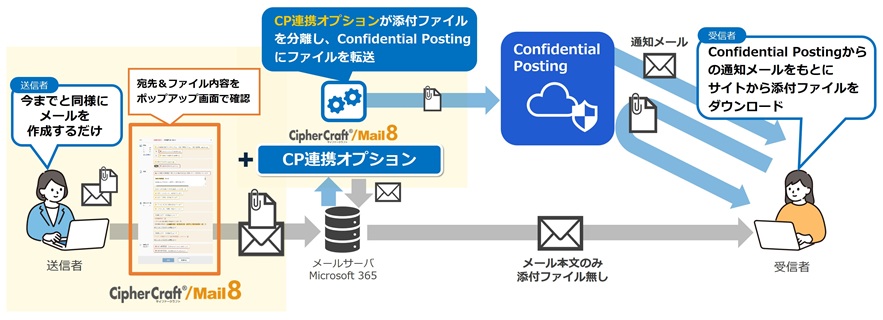 「CP連携オプション」は、送信者の手間なくメール誤送信対策と脱PPAPの両方できる機能です。