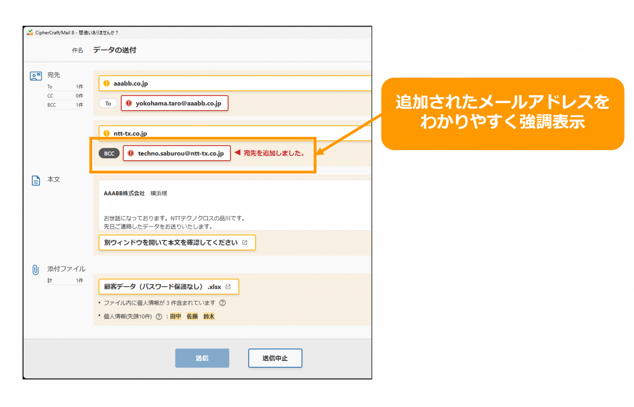 CipherCraft/Mail 8 では、上記に加え、追加されたメールアドレスを送信確認画面で強調表示します。追加されたメールアドレスが送信者にわかりやすく表示され、第三者がやりとりを監視しているという意識を持たせ、作為的な情報持ち出しを踏みとどまらせることができます。