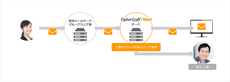 特定の送信メールに対し、あらかじめ設定したメールアドレスを自動的に宛先(BCCまたはCC)として加え送信します。これにより上長などの第三者がどのようなメールを外部に送信しているかメール内容を確認できます。例えば、派遣社員のメールのみ対象にすることや添付ファイルに個人情報が含まれているメールを送信する際に、自動的に上司を追加する等のご利用も可能です。内部不正対策の1つとして第三者をメールに追加することで、内部不正を抑止し、悪意のあるメール送信を未然に防ぎます。