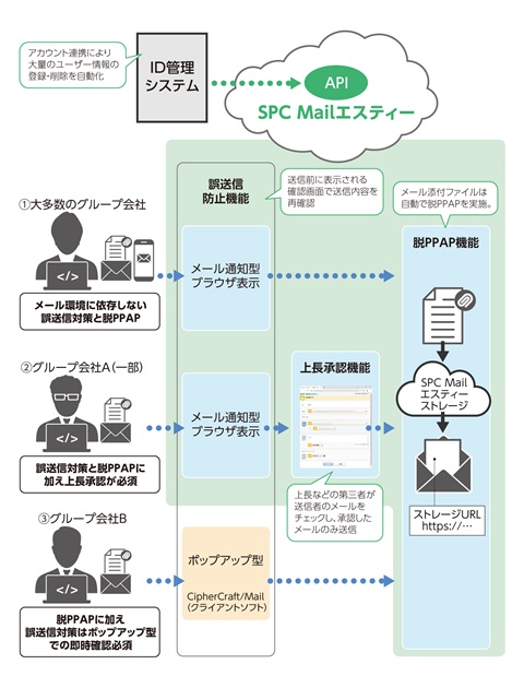 しかし、日々多くのメール送信をしている不動産仲介のグループ会社からは、以前からポップアップで誤送信防止の画面が表示できる他社のクライアント製品を使用しており、そのスピード・使用感を変えずに利用したいとの要望がありました。また、マンション管理を行う別のグループ会社の一部からは、個人情報のやりとりがあるため上長承認を行いたいという要望がありました。
